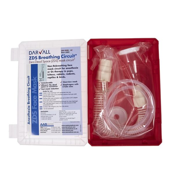 Patented, autoclavable Non-Rebreathing ZDS Face Mask “T-Piece” circuit: ZDS Mask 40mm (1 1/2″) OD clear polycarbonate Supplied with 1.2M (48″) autoclavable connection tubing to fresh gas “In” & WAG “Out” plus two silicon diaphragms: 12mm (1/2″) ID aperture (#2890) & 20mm (3/4″) ID aperture (#2891). High FG flow 200ml/kg/min for animals to 3kg (7lb) where sterility is required.