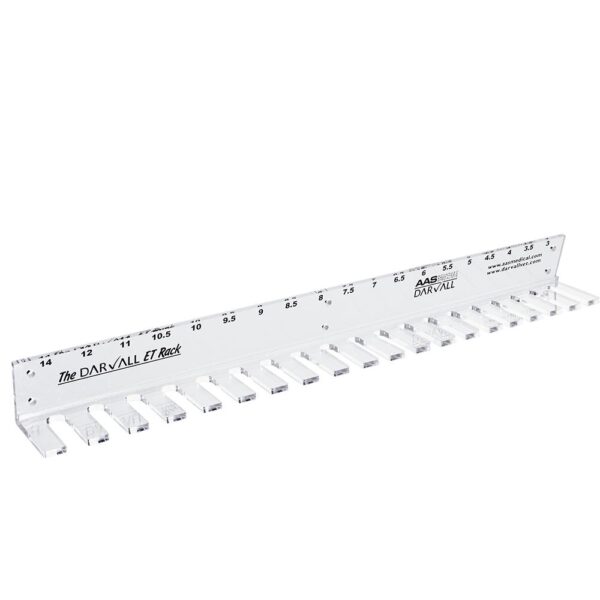 Organise ET Tubes with clear ID, ready access, compact vertical storage so can drain/dry: clear acrylic wall-mount rack; 19 indexed slots printed with ET tube sizes 3 to 14; holds up to 54 ET tubes vertically – 2 to 3/slot. Rack Length 65cm (25.5″) x 8.0cm (3″) slots x 6.5cm (2.5″) vertical back (screw holes for wall-mounting).