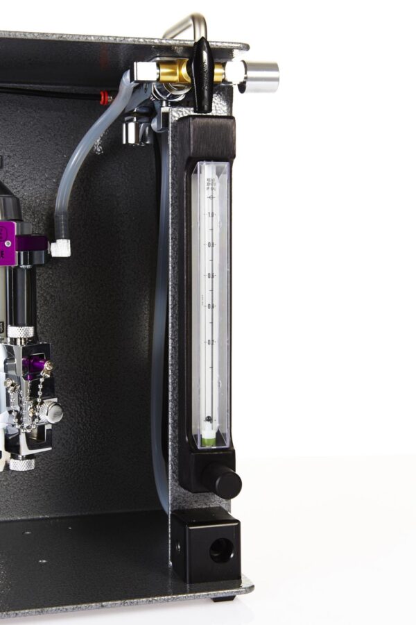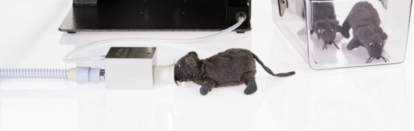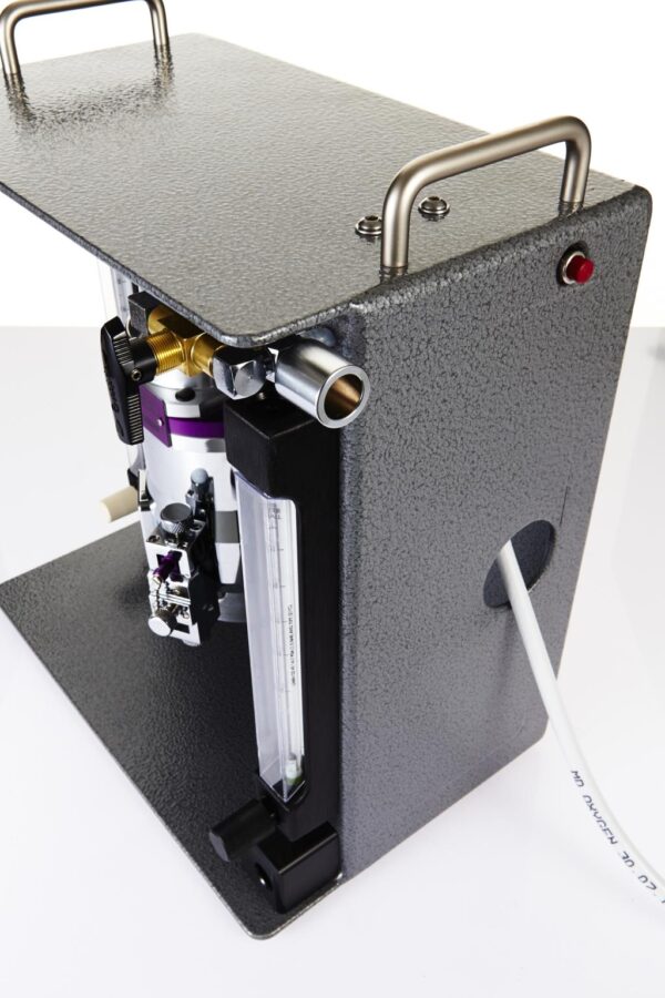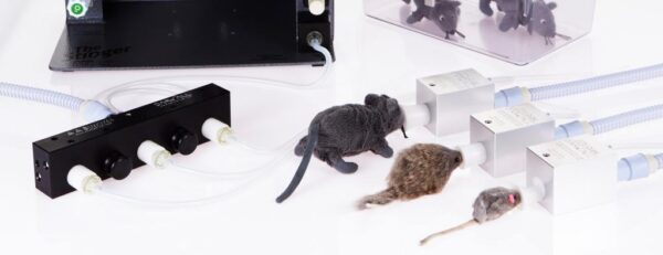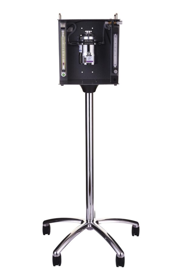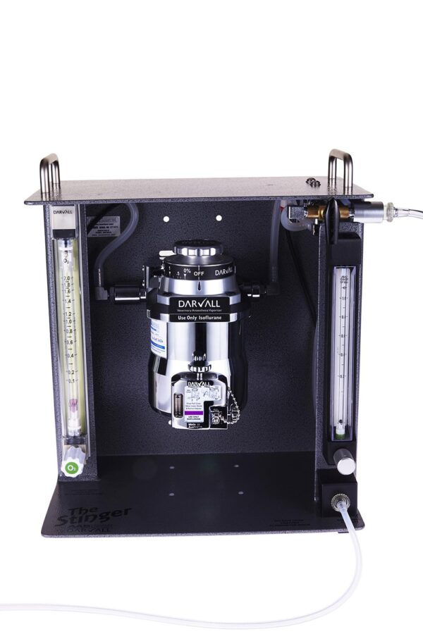 Fully Mobile Stinger research machine, dual outlets for 2 to 5 rodents: Mobile base (#1569) & IV pole (#502) assemblies with Research Table-Top (#2848) includes monitor shelf, O2 hose, 0-2 LPM expanded scale O2 flowmeter, Bain NRB and ZDS mask circuits, 3-way switch with 2 gas outlets with different Iso concs. via 0-1 LPM secondary flowmeter. Includes Users Guide plus Android & App. to calculate settings. NOT included: vaporiser & mount.